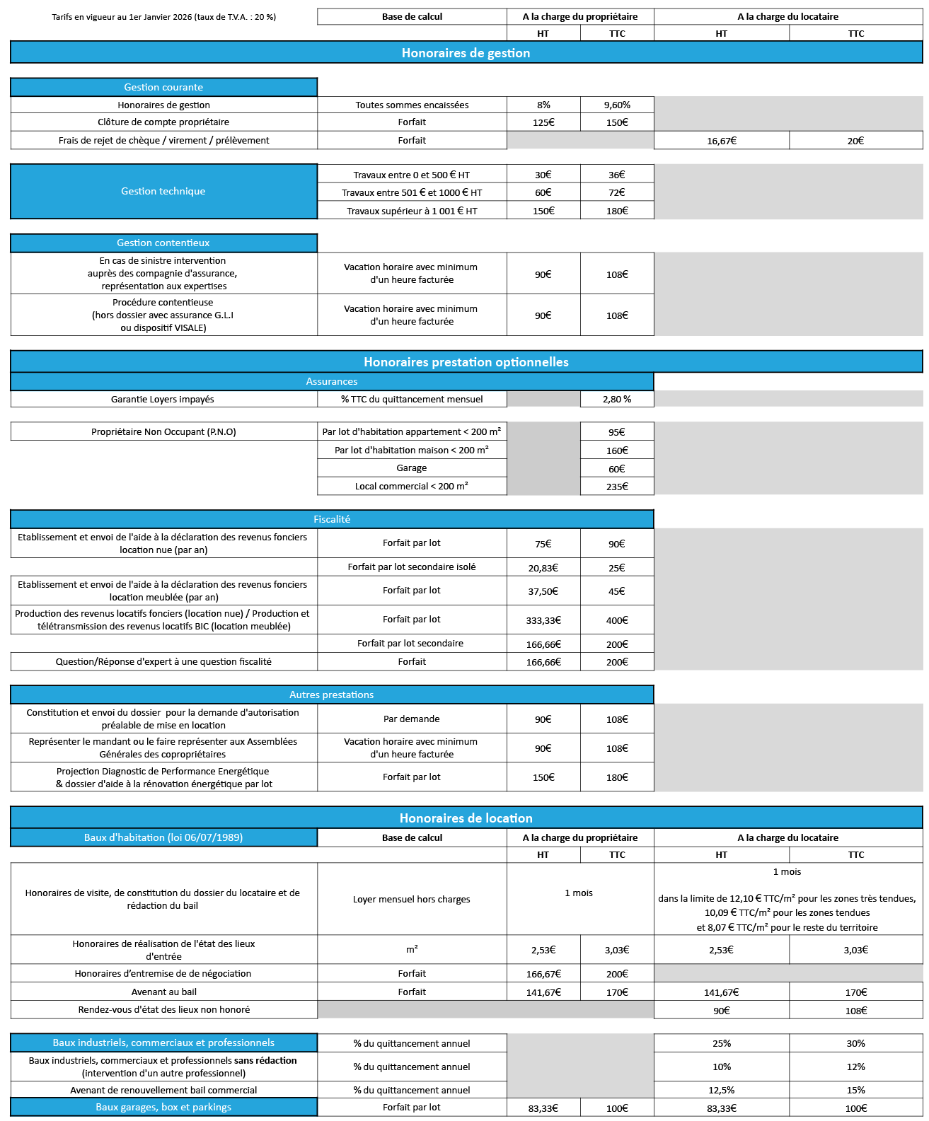Tarifs en vigueur au 1er Janvier 2026 (taux de T.V.A. : 20 %)